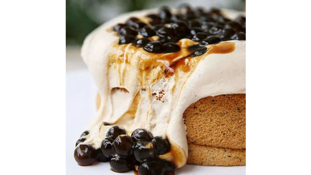 -Tạo 1 lỗ trũng ở giữa cốt bánh gato, đổ kem trà sữa cùng trân châu đen vào lỗ này, trên mặt bánh phủ kín 1 lớp kem trà sữa.